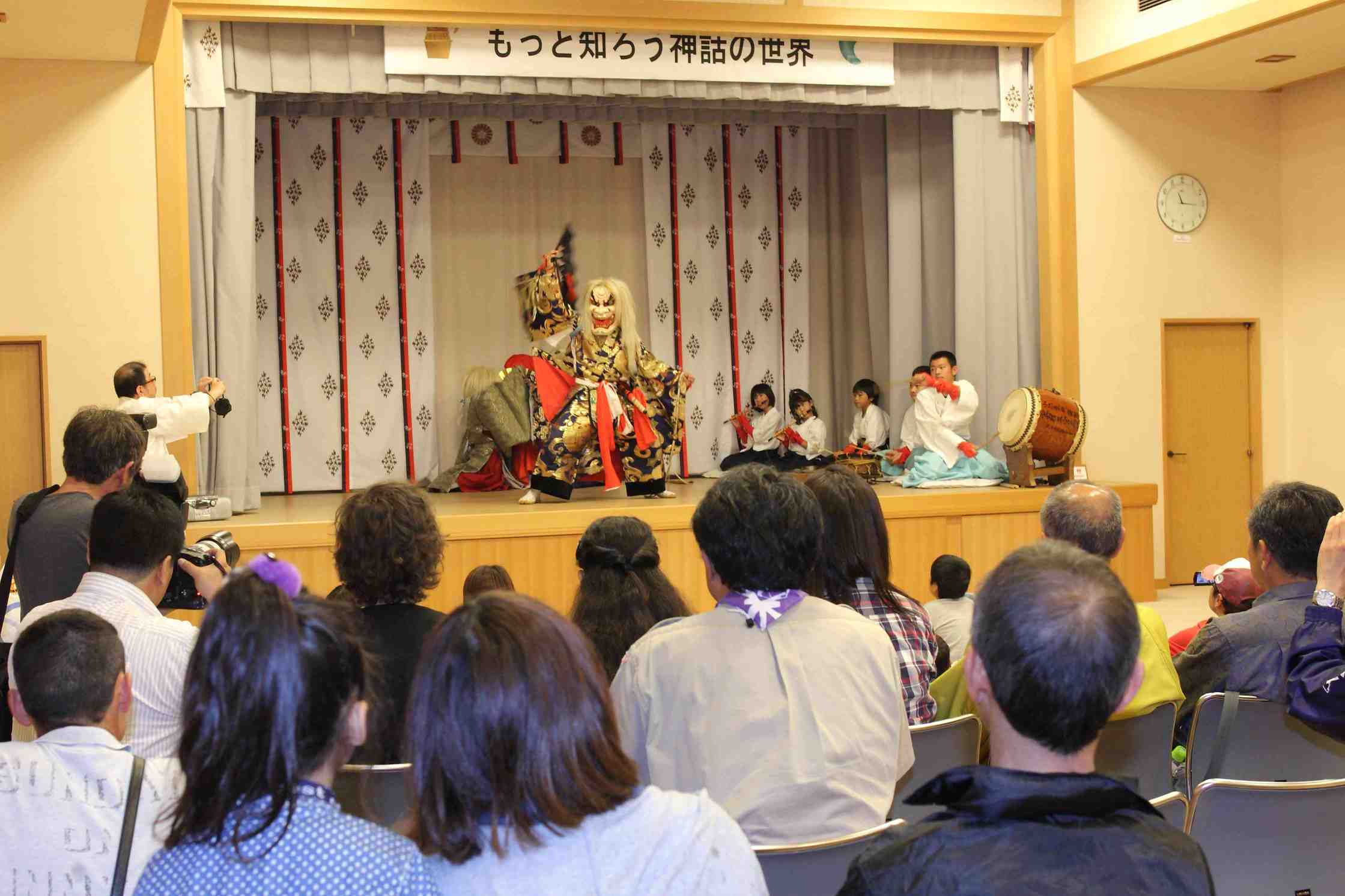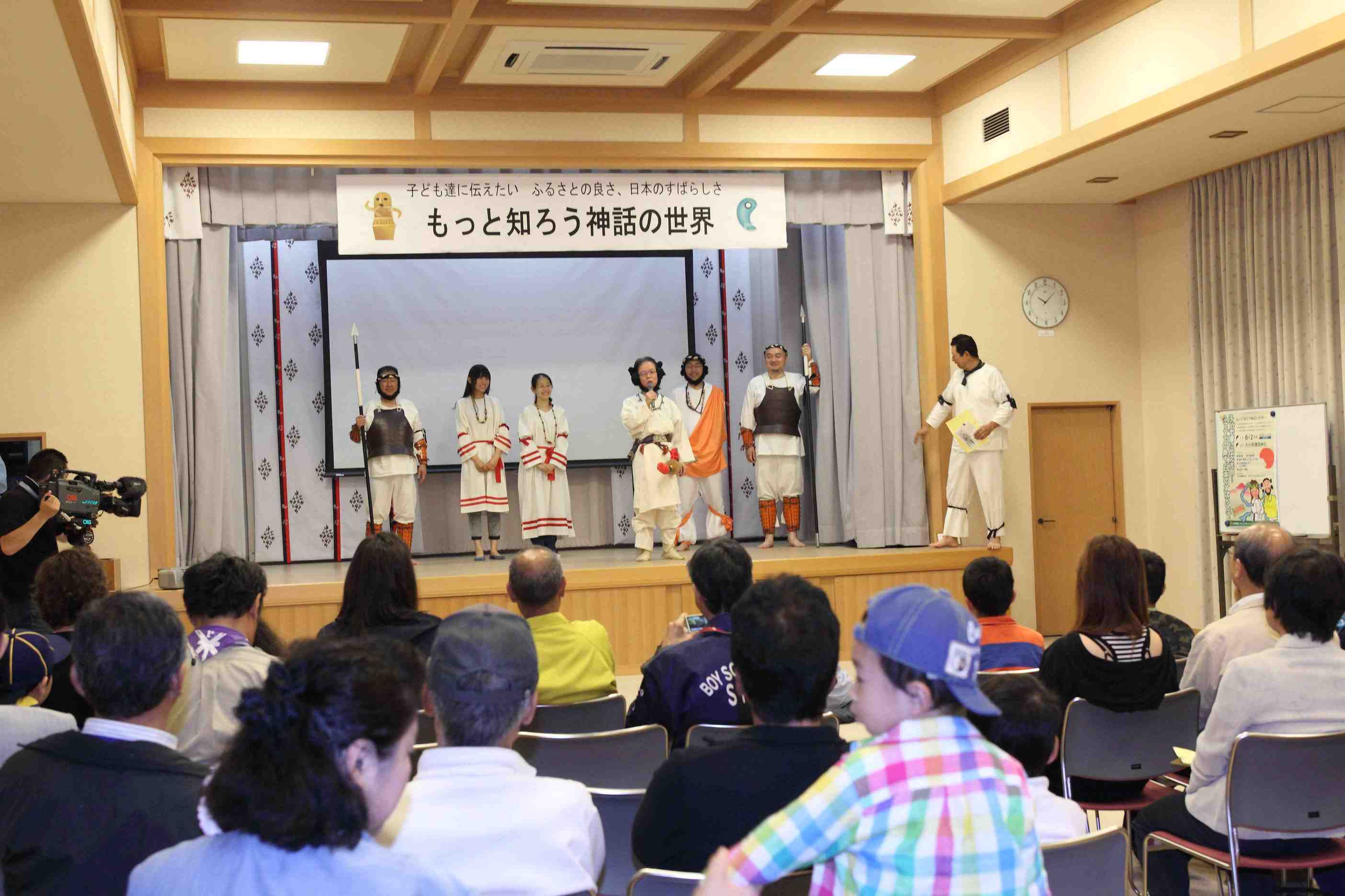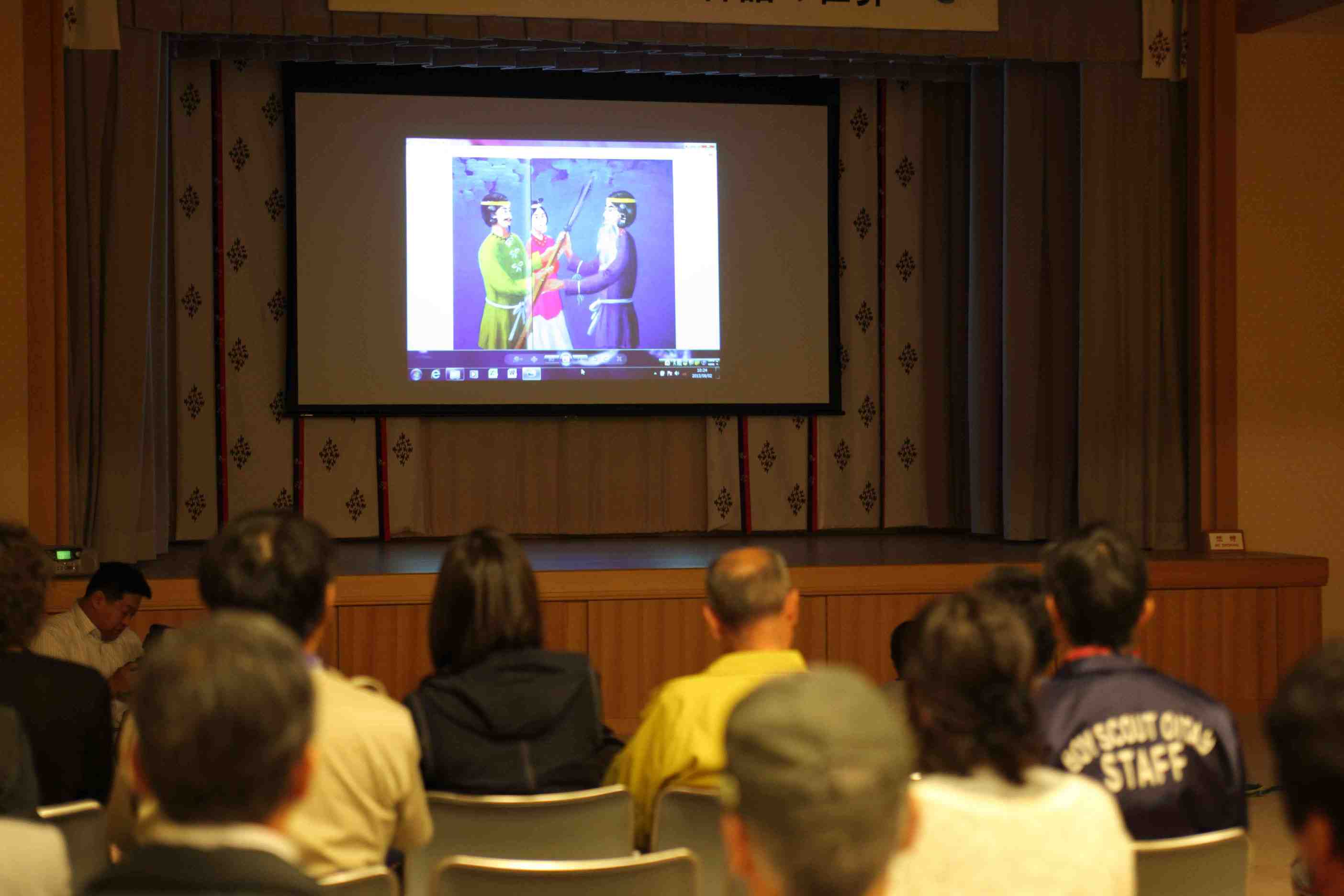 10時より会長の歓迎の挨拶の後、メインイベント、小野会員作成の神話のスライドにによる紙芝居、「國生み」「岩戸開き」「大蛇退治」でオープニングし、楽しいお話と綺麗な画面に子供達も真剣に見入っていました。