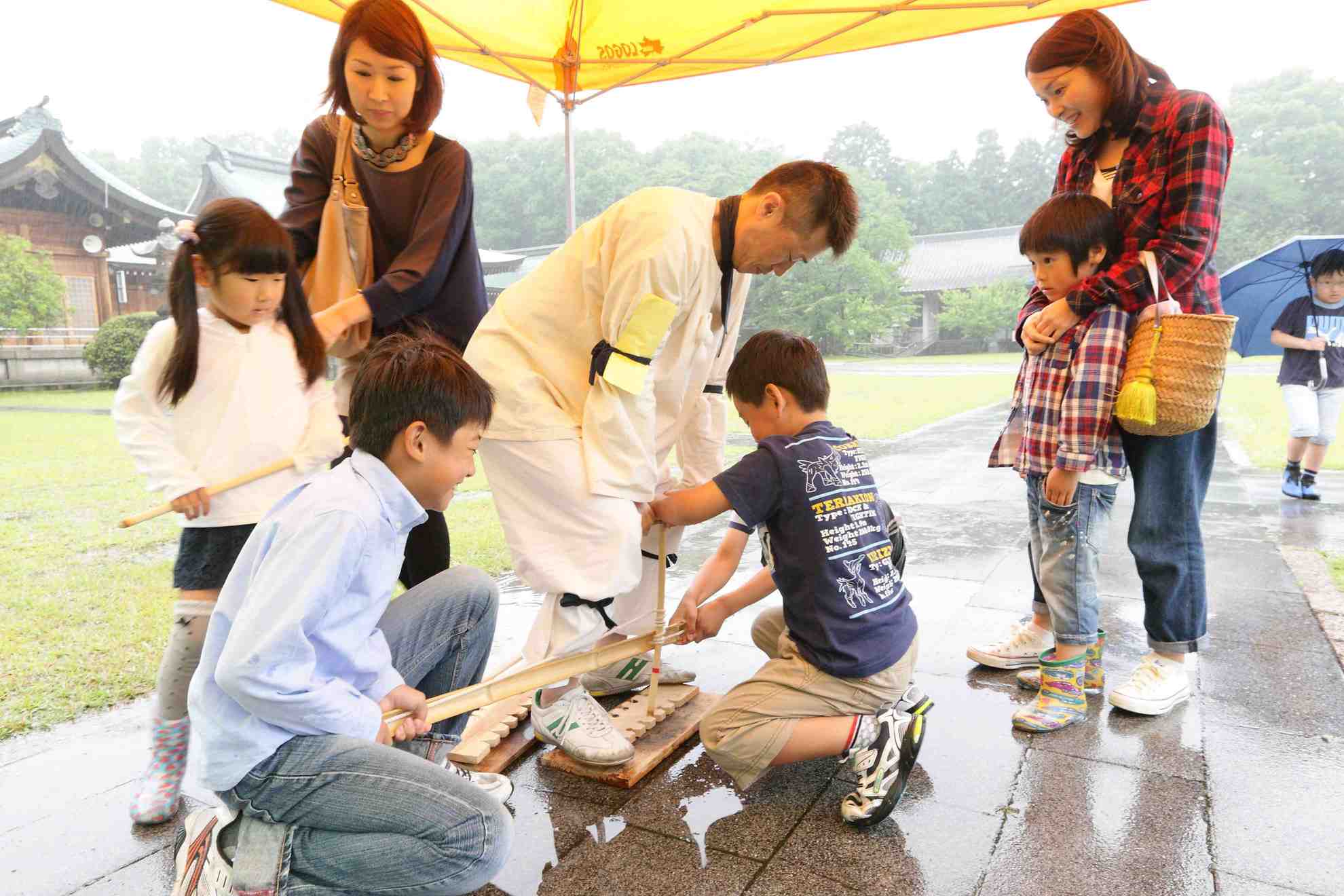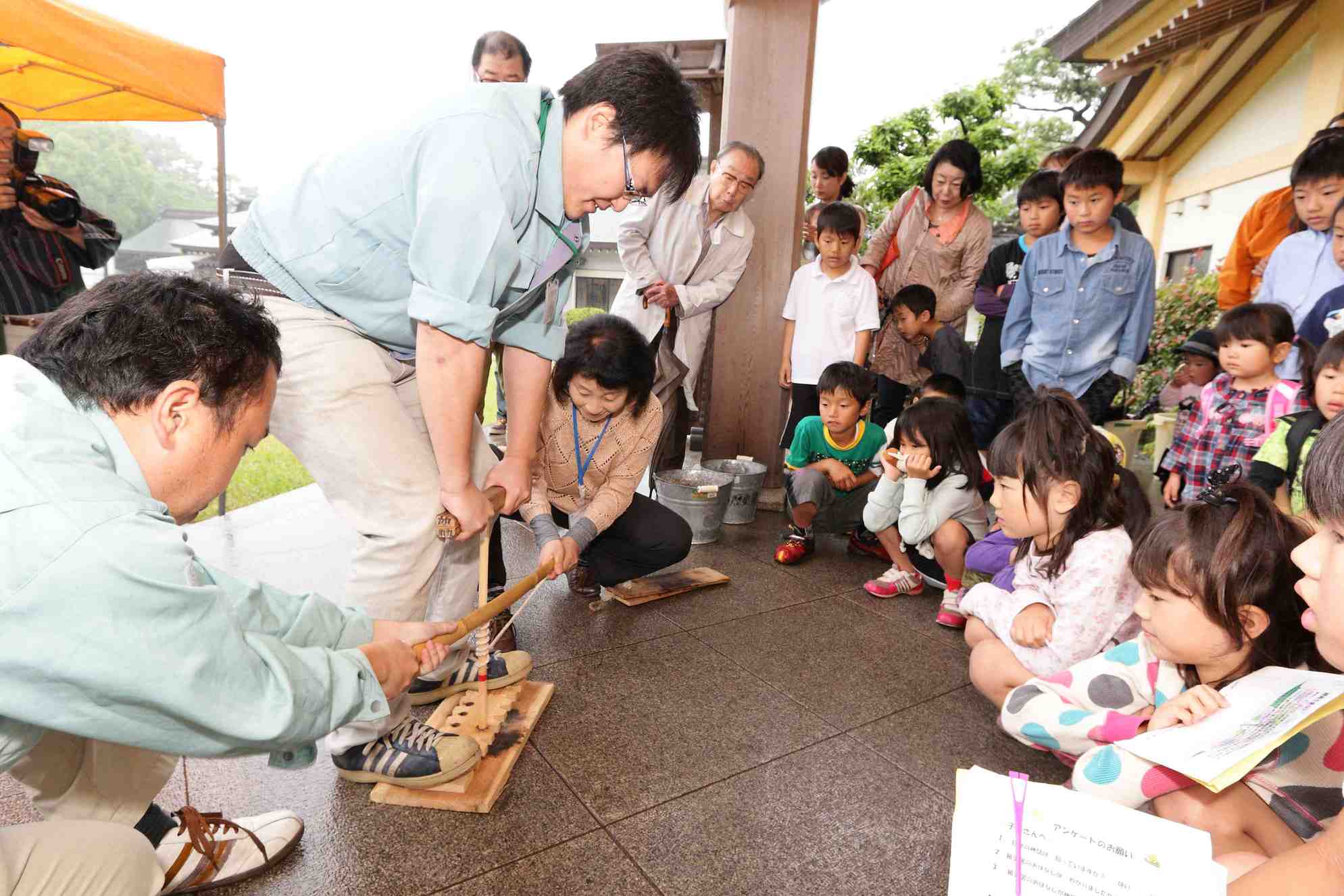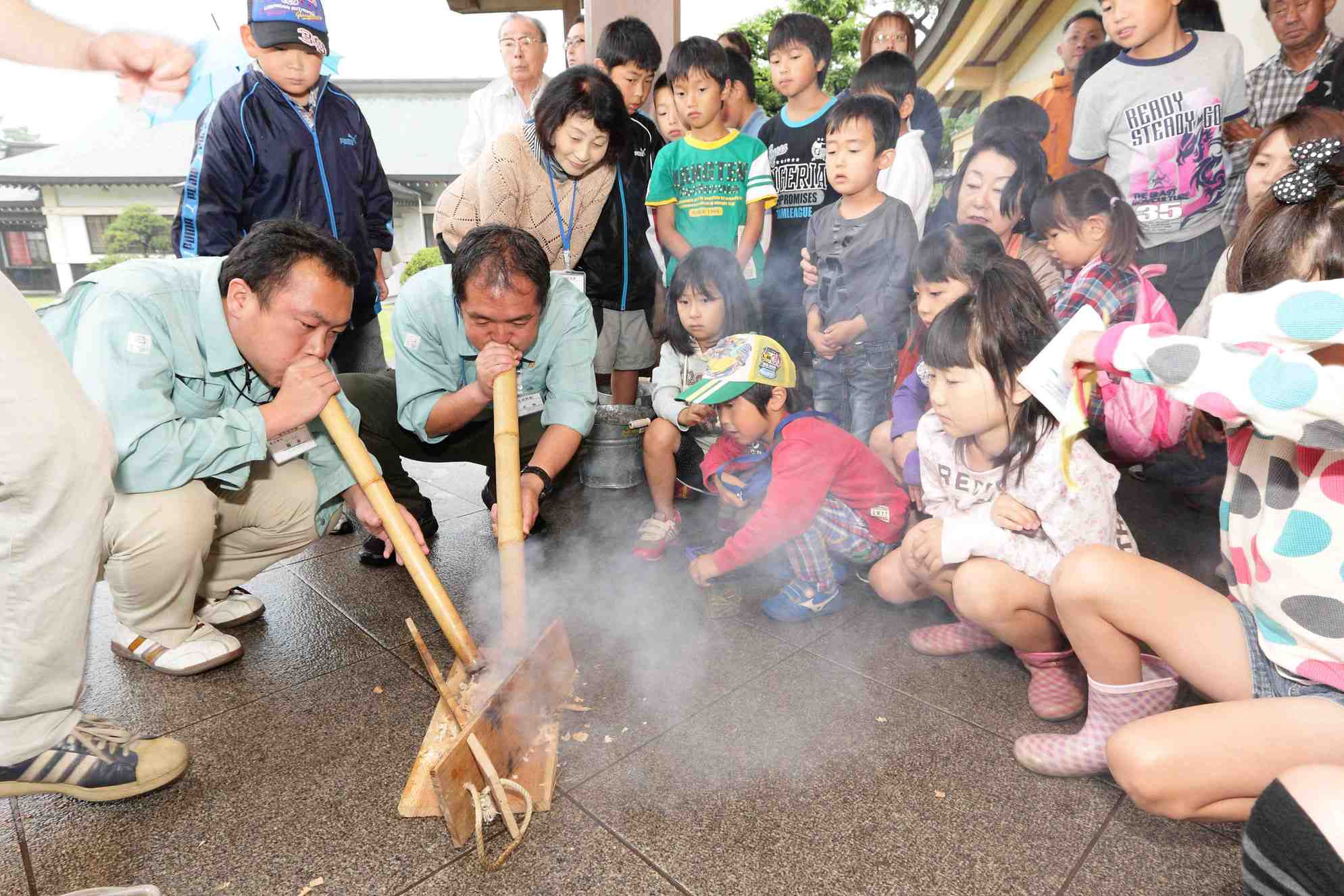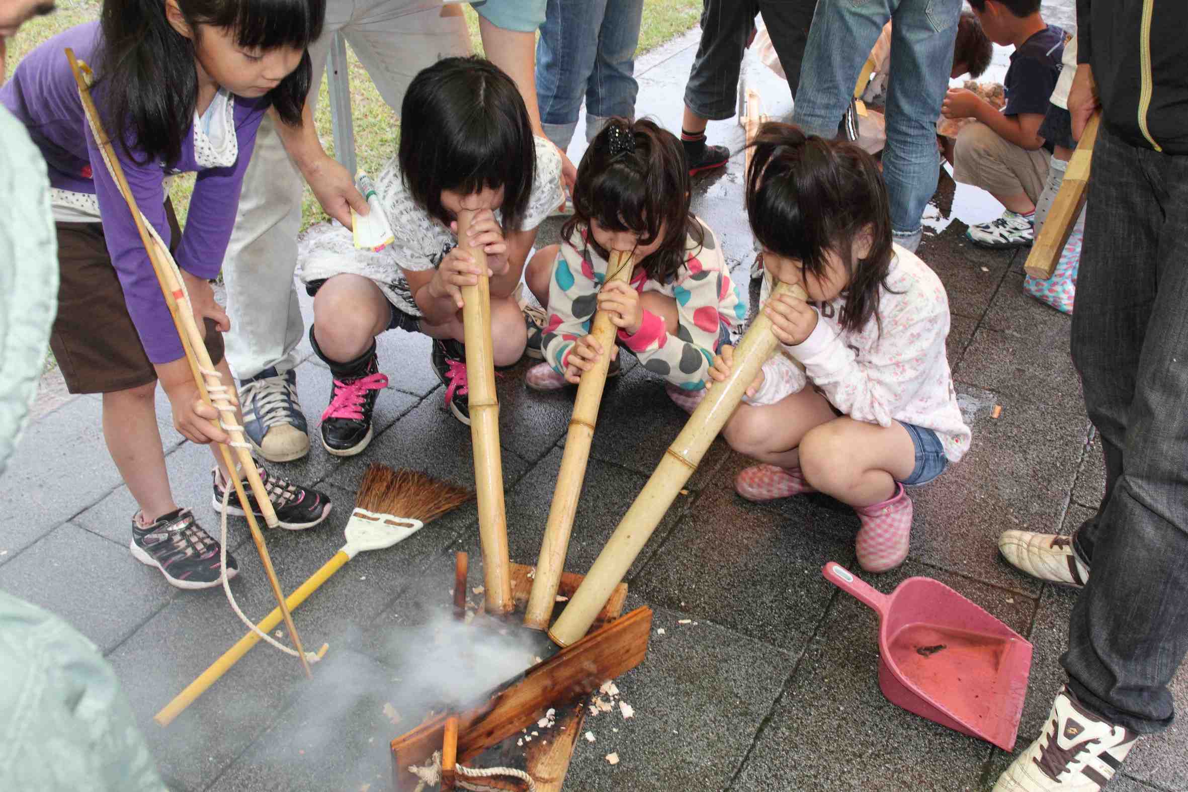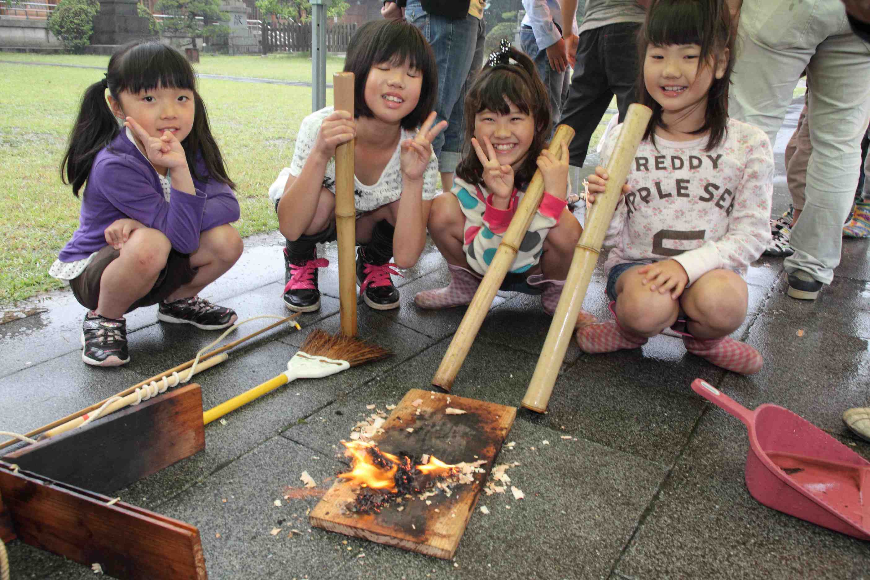 火おこし体験、奈須会員が担当、また大分歴史資料館より2名の方に指導していただき、奮闘しました。雨のため、火が付きにくい面もありましたが、皆、着火に成功歓声があがりました。子供達は予想以上に興味を持ち時間が少しオーバーしましたが、好い経験になったと思います。