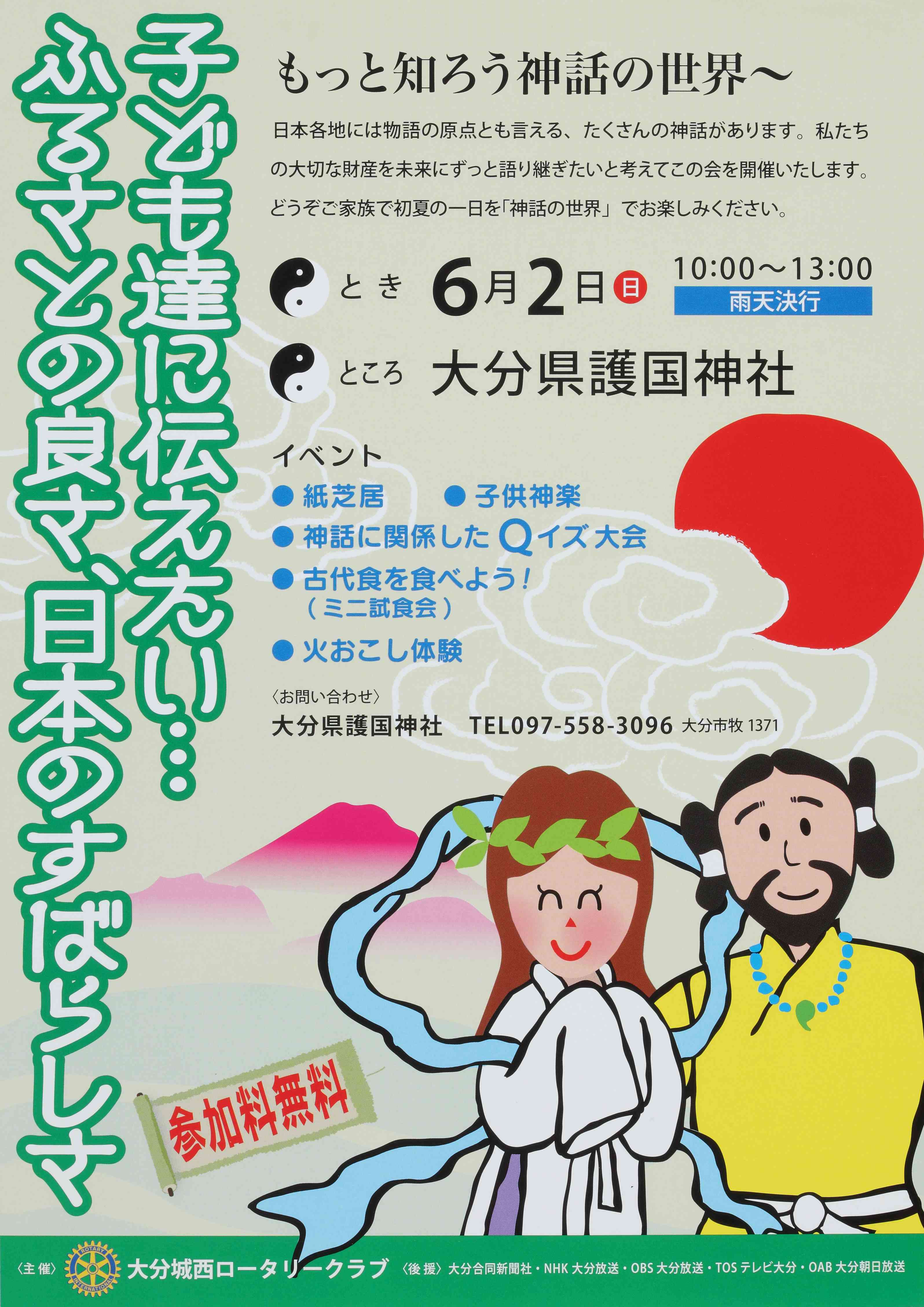 当クラブは長い間、未来を担う小学生を対象に情操教育を伸ばす観点から「豊っ子」の俳句集編纂に関与して来ました。しかし諸事情より残念ながら継続出来なくなり、会員皆で今後の活動について話し合い、上記のスローガンのもと、今期は護国神社で6月2日(日)子供たちと神話を親しむ会を持つ事を決め、年頭より準備に掛かりました。