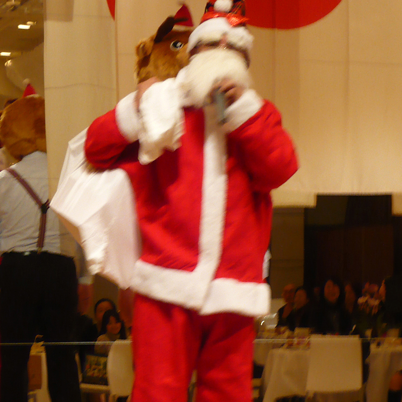 21時5分に会場に現れ、子どもたちにクリスマスプレゼントを配ってくれました。その後、大人たちが